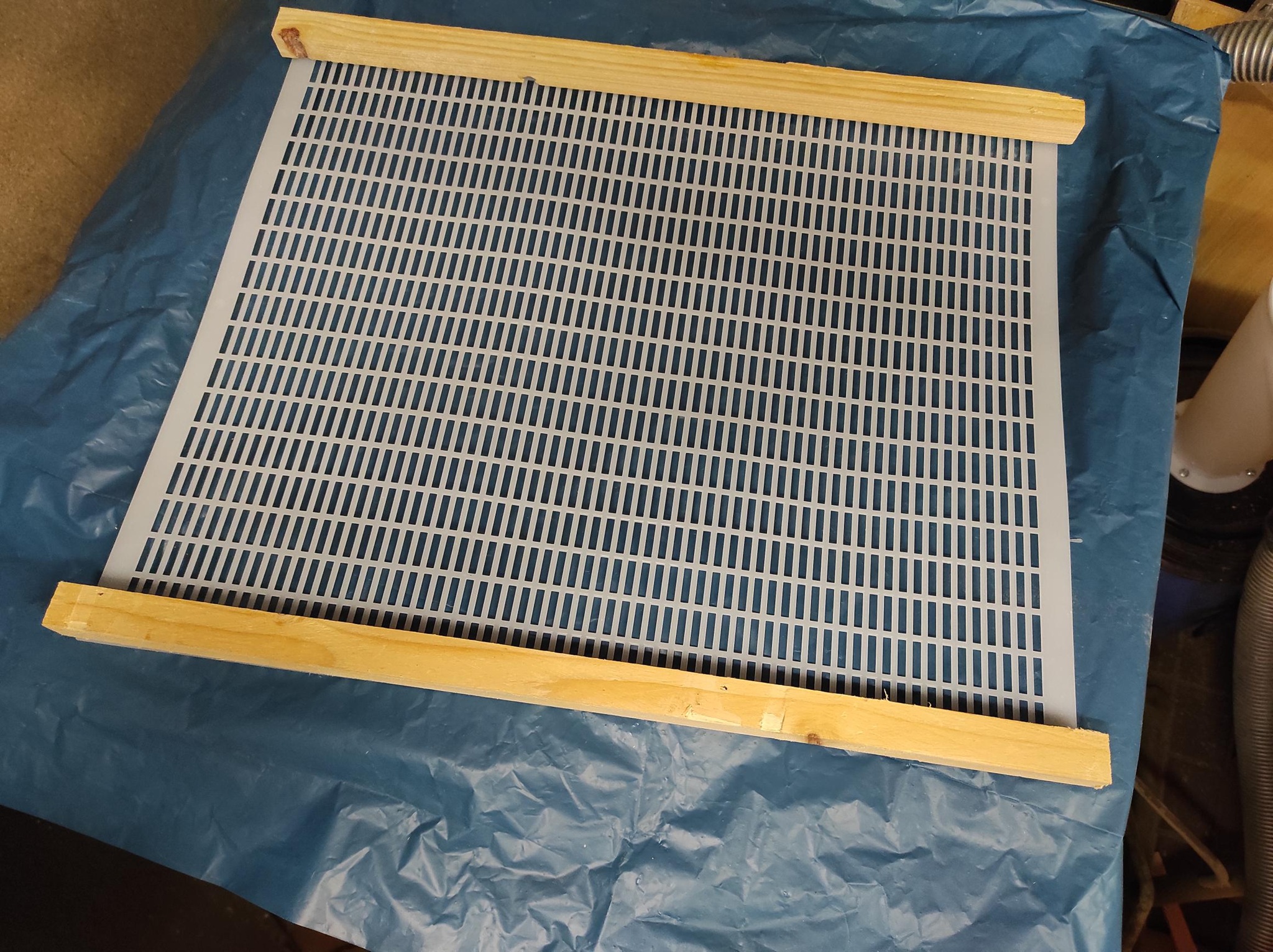Allerdings kann ich ein so modifiziertes Absperrgitter auch mit einem (verschließbarem) Flugloch versehen und für das Demarée-Verfahren benutzen oder auch zum Aufsetzen von 'Schwächlingen' auf starke Völker im Frühjahr. Das Flugloch ermöglicht auch den schlüpfenden Drohnen die Beute zu verlassen.