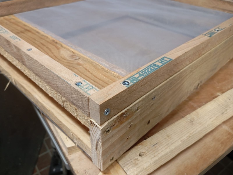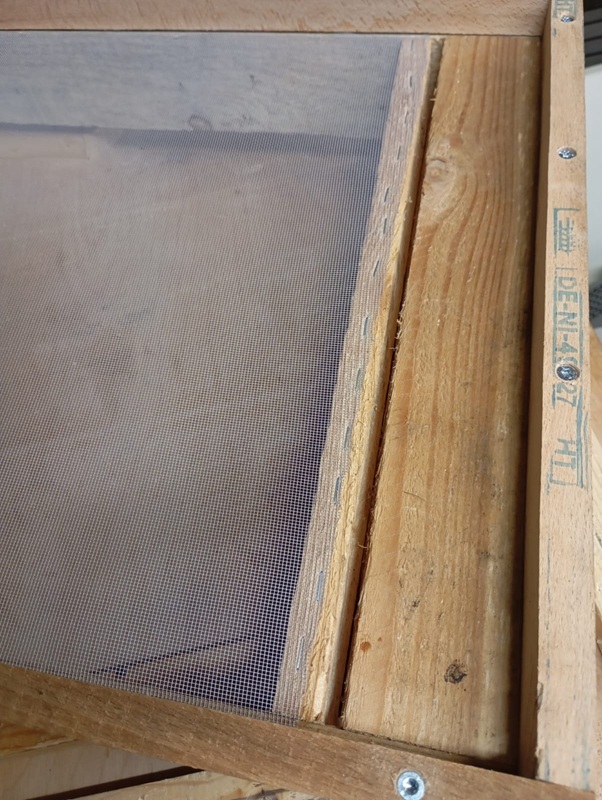 Auf der Oberseite wird das Varroagitter aufgetackert und anschließend die vier Leisten aufgeschraubt. Der Fluglochschlitz muss natürlich frei bleiben.