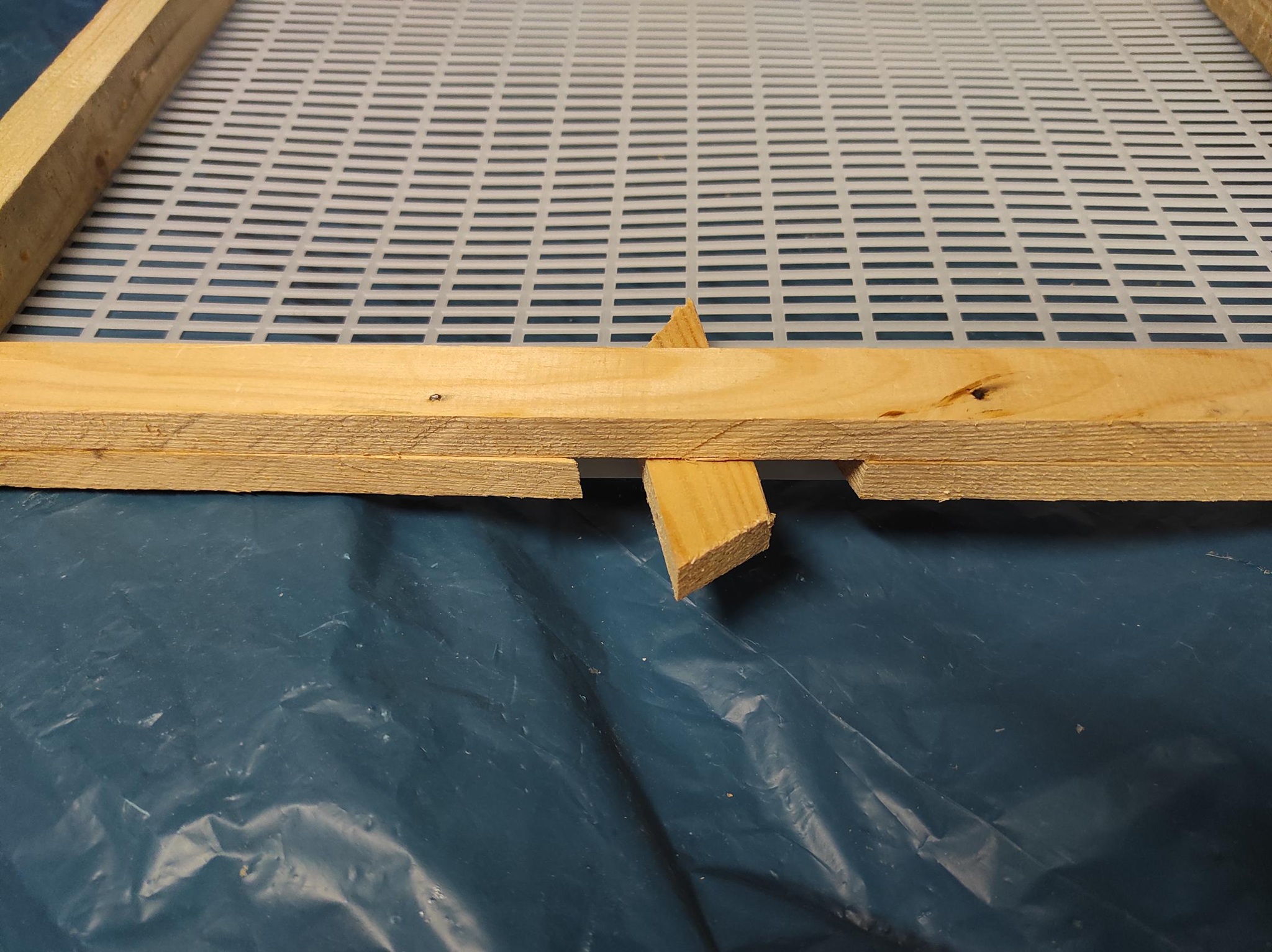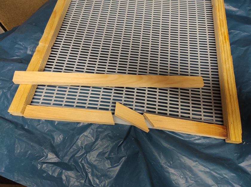 Nachfolgend einige Bilder zum Bau des modifizierten Absperrgitters. Der Querschnitt der Leisten ist 20x20 mm, für die 'Fluglochanlage' 20x10 mm. Die Längen für das Zandermaß sind 52 bzw. 38 cm. Da das Langstroth-Gitter ein Maß von 51 x 41,5 cm hat, wird der Rahmen etwas überstehen, vor allem in der Länge beidseitig ca. 5 mm. Wenn gewünscht, kann diese Spalte mit einem Türdichtgummi aufgefüttert werden.