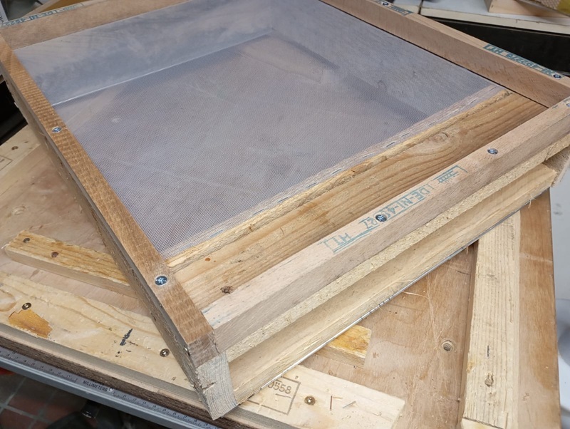 Auf der Oberseite wird das Varroagitter aufgetackert und anschließend die vier Leisten aufgeschraubt. Der Fluglochschlitz muss natürlich frei bleiben.